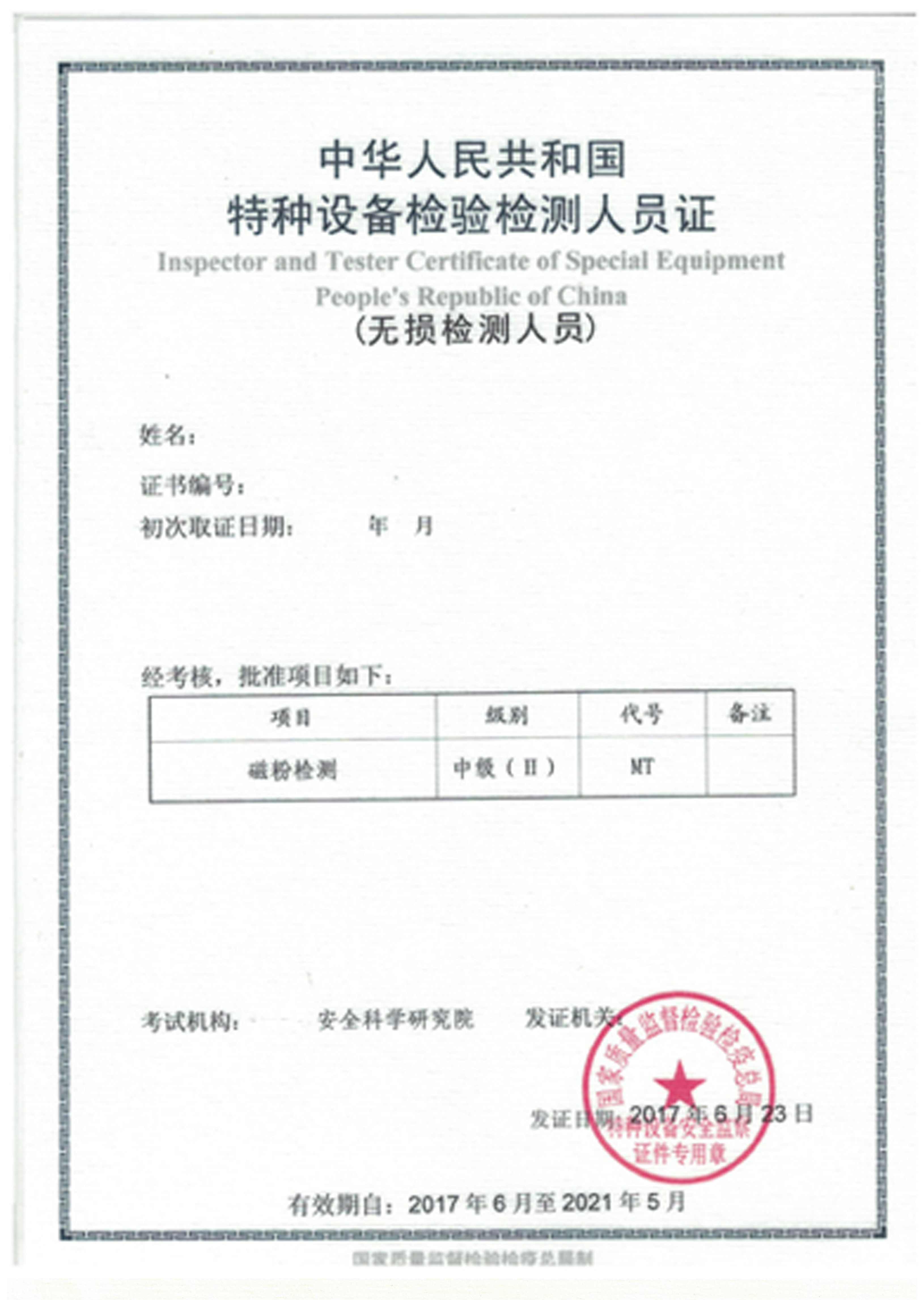 3、无损检测人员证书:射线胶片照相检测(RT)、脉冲反射法超声检测(UT)、渗透检测(PT)、磁粉检测(MT)